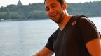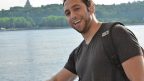 This man’s skin has turned intensely orange from the light reflected off the canopy he is standing under.